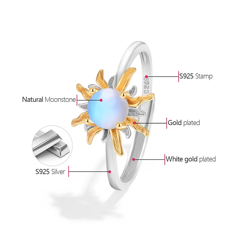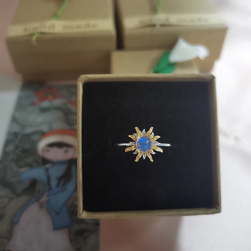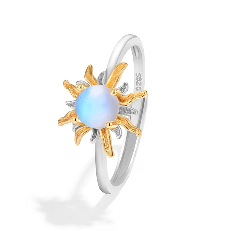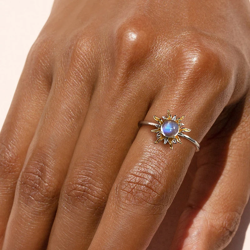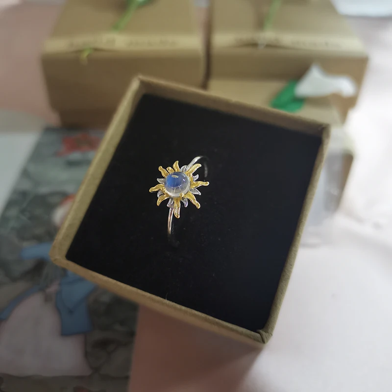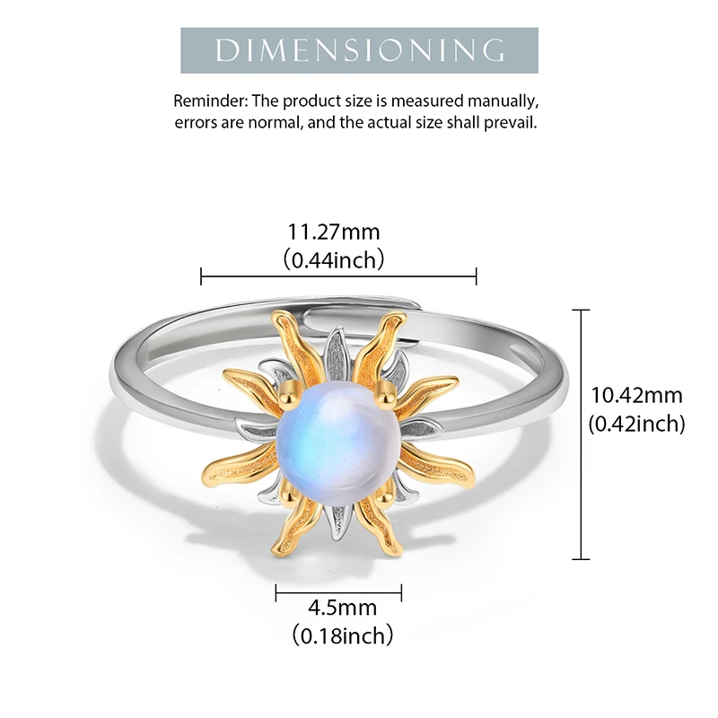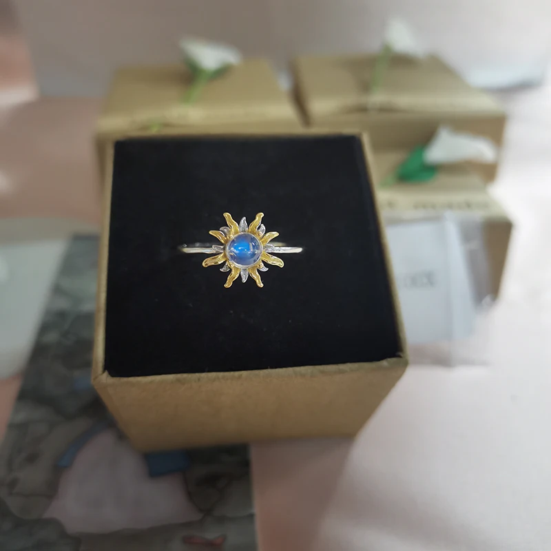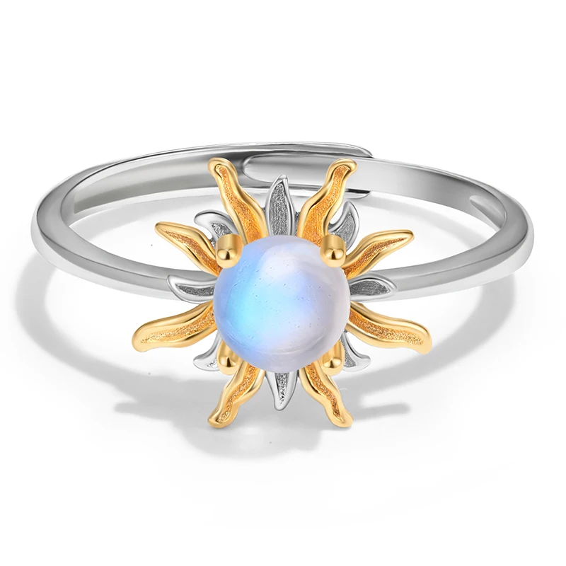 Natural Blue Moonstone Radiant Sun Adjustable Rings for Women Real 925 Sterling Silver Luxury Quality Fine Jewelry.